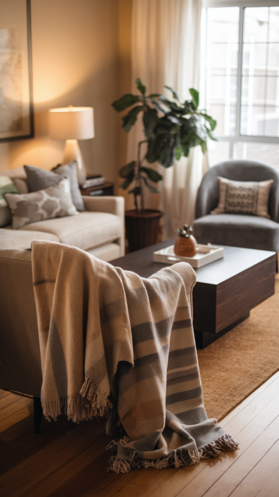 Add a few chunky knit or faux fur throw blankets to your room for instant warmth and texture. Drape one over a chair, bed, or sofa to keep it within easy reach. Opt for neutral colors like beige or gray for versatility or choose a bold hue to make it a focal point. These blankets are perfect for curling up with a book or movie on chilly evenings. A must-have for any cozy space.