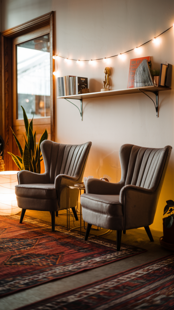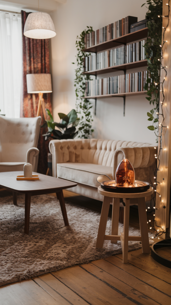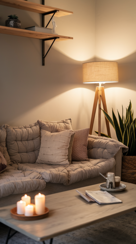 Use soft, warm lighting to create a relaxing atmosphere. Table lamps, floor lamps, or string lights with dimmable bulbs work best for controlling the brightness. Avoid harsh overhead lights and opt for options with warm-toned bulbs. Consider placing lighting near seating or reading areas for functionality. Perfect for setting a calm, cozy mood.