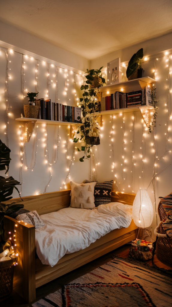 Drape fairy lights around your bedframe, shelves, or along the walls for a magical glow. Opt for warm white or soft yellow tones to avoid harsh lighting. These lights can create a whimsical and cozy vibe in any room. Use battery-operated options for hassle-free placement. A budget-friendly way to enhance the ambiance.