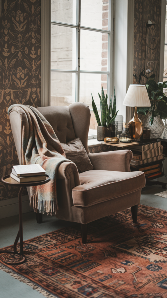 Add a plush armchair with a soft throw to create a personal reading or relaxation corner. Choose one with a deep seat and upholstered fabric for extra comfort. Position it near a window or lamp for the best lighting. Pair it with a small side table to hold your drink or book. A functional and cozy focal point.