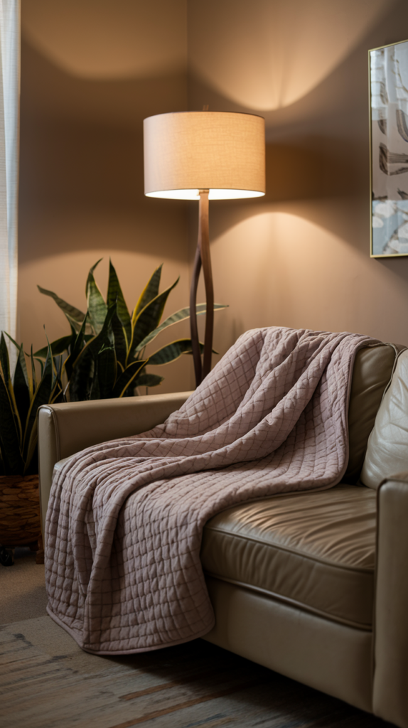 Invest in a weighted blanket for ultimate relaxation and stress relief. These blankets provide gentle pressure, simulating a hug and promoting better sleep. Choose one with a soft cover in neutral tones for a cozy and calming aesthetic. Use it as a functional accent on your bed or sofa. Ideal for unwinding after a long day.