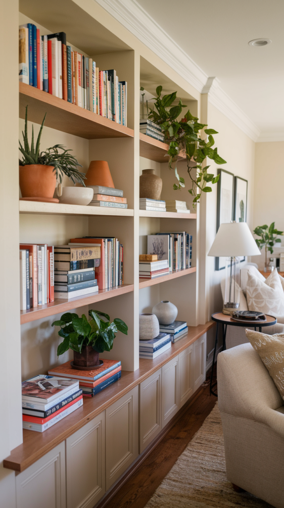 Incorporate a small bookshelf or built-in shelves to display books, plants, and decorative items. Choose warm wood finishes or paint the shelves in a soft neutral tone. Arrange items thoughtfully with a mix of sizes and textures for visual interest. It’s a practical way to add character to your space. Great for book lovers and collectors.