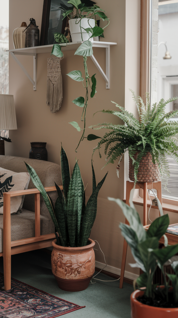 Add life and color to your room with a few indoor plants like pothos, snake plants, or ferns. Place them on shelves, windowsills, or in decorative pots on the floor. Plants improve air quality and bring a touch of nature indoors. Pair with woven or ceramic planters for an earthy vibe. Perfect for creating a tranquil environment.