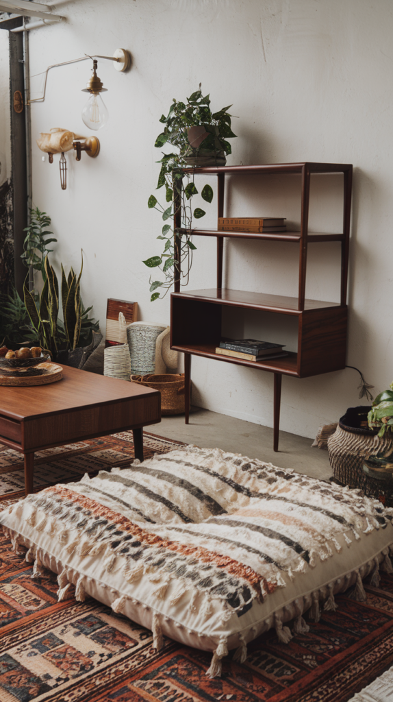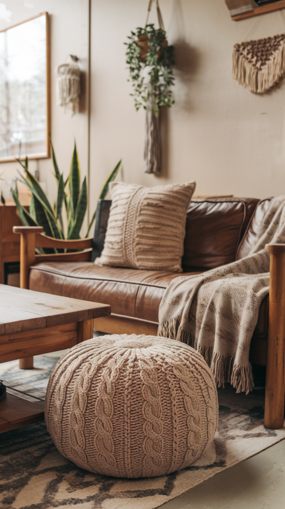 Add oversized floor cushions or poufs for additional seating or lounging. Choose soft fabrics like corduroy or velvet in earthy colors. These are great for casual movie nights or when guests visit. Pair them with a low coffee table for a bohemian vibe. A versatile and cozy addition.