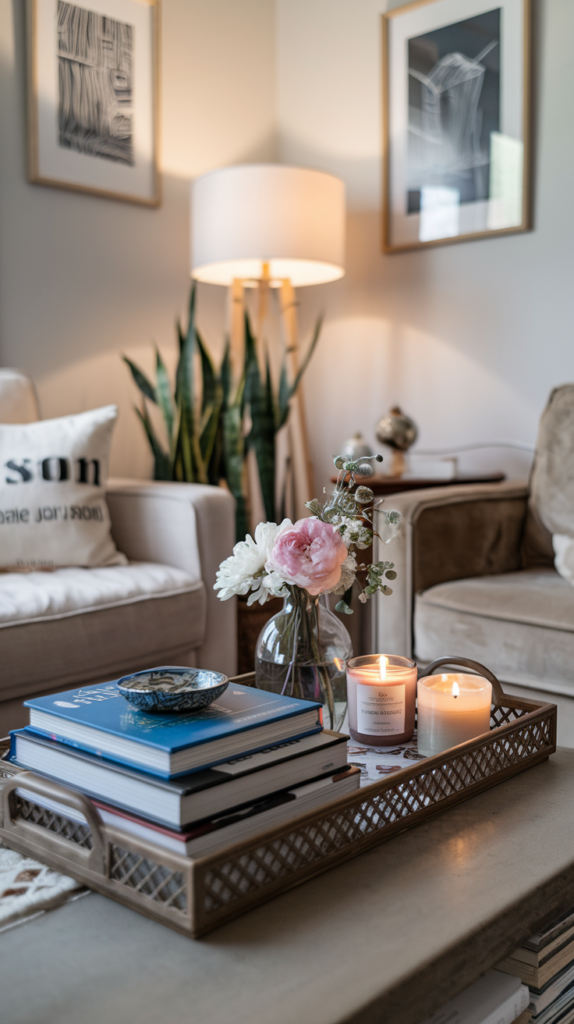 Use a wooden or metallic tray to organize candles, books, or small décor items. Place it on a coffee table, ottoman, or dresser for a tidy and chic display. Add a small vase of flowers or a stack of coasters for functionality. It’s a stylish way to keep things organized. A simple but impactful accessory.