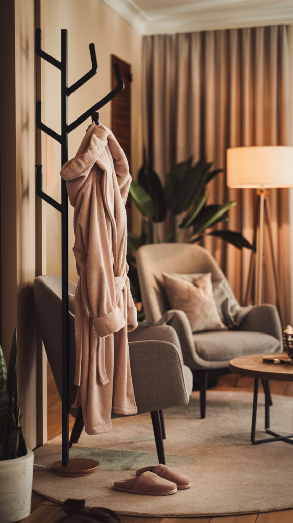 Keep a plush robe and cozy slippers nearby for ultimate comfort. Hang the robe on a stylish hook or drape it over a chair for easy access. Choose soft materials like fleece or cotton to match the cozy aesthetic. Perfect for those lazy mornings or evenings.