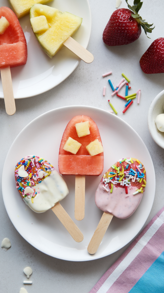 Cut melons, pineapples, and strawberries into egg shapes using a small cookie cutter. Slide them onto popsicle sticks for a fun and healthy treat. Dip half of each fruit pop in melted yogurt chips or white chocolate and decorate with sprinkles or shredded coconut. Let them harden on parchment paper before serving. A refreshing and colorful snack perfect for little hands!