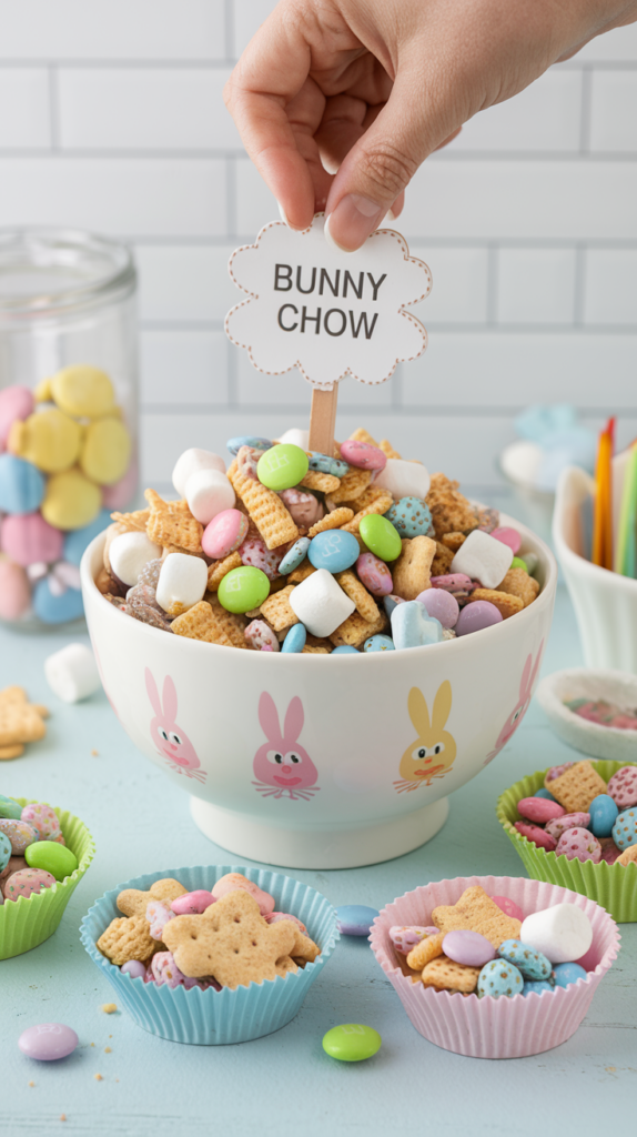 Mix Chex cereal, melted white chocolate, and powdered sugar in a big bowl. Toss in pastel M&Ms, mini marshmallows, and bunny-shaped graham crackers. Serve in Easter-themed cupcake liners or little treat bags. Add a tiny sign that says “Bunny Chow” for extra fun. A sweet, crunchy, and easy-to-make snack!