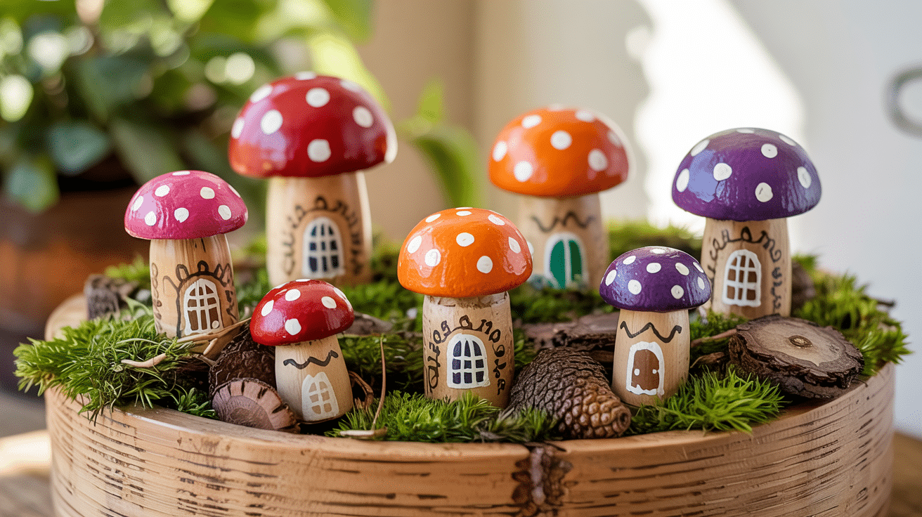 Use acorn caps as mushroom tops and wine corks or small wooden pegs as the stems. Paint the caps in bright reds, oranges, or purples with white polka dots for a whimsical look. Add tiny door details and windows with a fine-tip paint pen. Arrange in mossy planters or fairy gardens as tiny forest dwellings. A magical craft that feels straight out of a woodland tale!