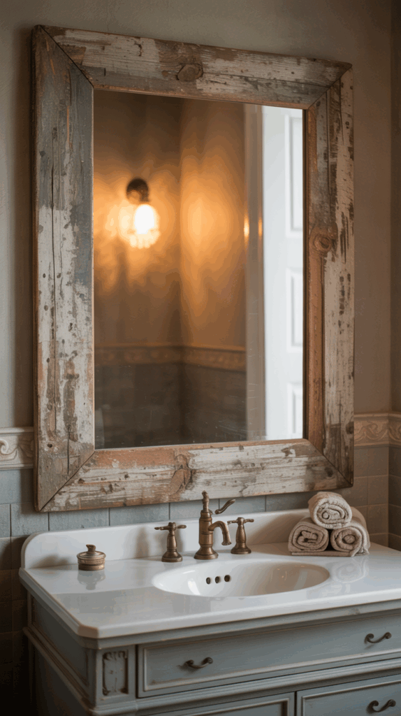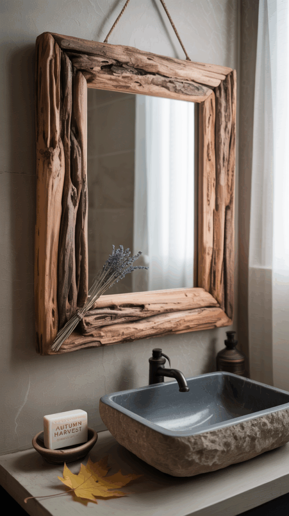A rustic mirror frame can instantly warm up your bathroom. Its natural wood tones bring a cozy feel that pairs perfectly with fall decor. This simple addition makes a big impact on your bathroom’s style without being overwhelming.