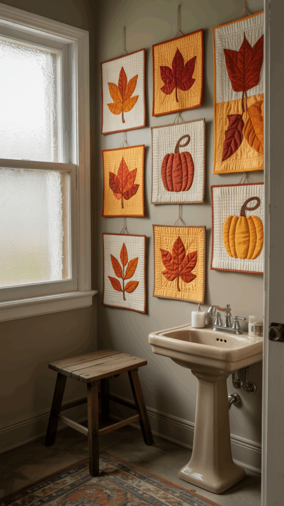 Add a touch of warmth to your bathroom with charming quilted wall hangings. These colorful pieces, featuring autumn leaves and pumpkins, can create a cozy vibe. They’re perfect for celebrating the fall season while brightening up your space.