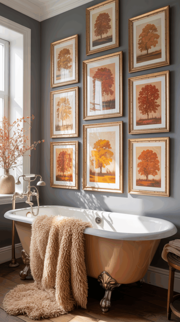 Vintage autumn prints can bring a cozy feel to your bathroom. Framed images of orange-hued trees add a touch of warmth and style. These prints are perfect for celebrating the fall season while keeping your space chic.