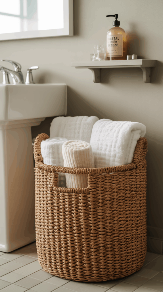 Woven baskets are a fun and stylish way to organize your bathroom. They come in different sizes and shapes, making it easy to tuck away toiletries and towels. Plus, they add a warm, rustic touch that fits perfectly with fall decor!