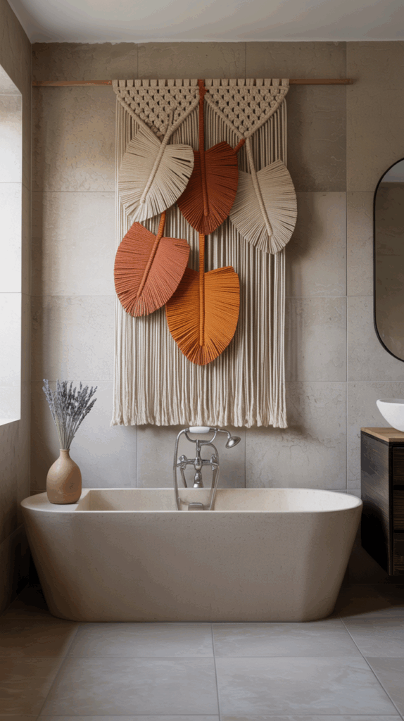 Wall hangings can really bring a splash of fall into your bathroom. A macramé piece with autumn-themed designs adds warmth and charm. Pair it with some cute seasonal touches for a cozy vibe!