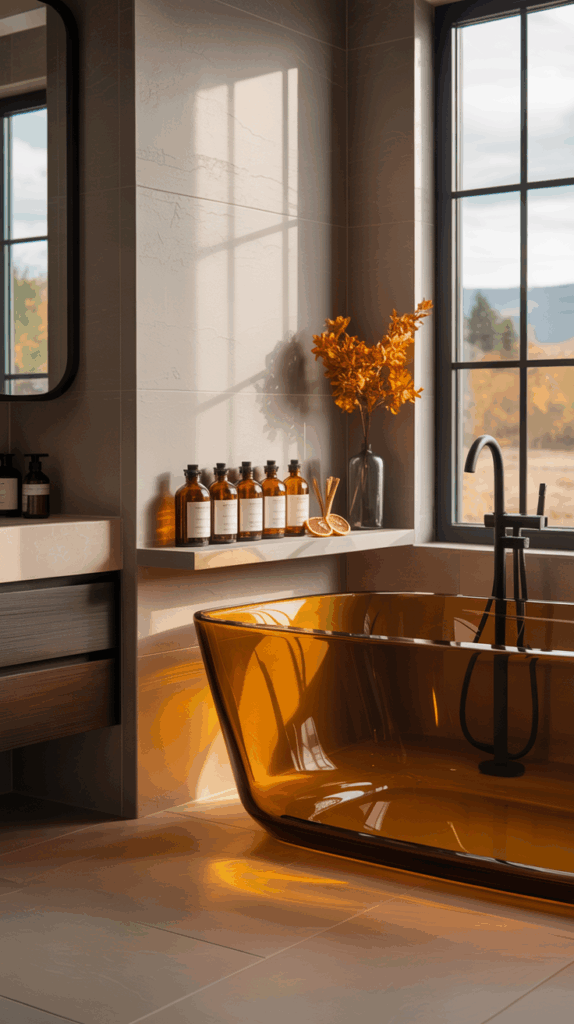 Amber glass accents are a warm and inviting choice for fall bathroom decor. These beautiful pieces add a touch of color and texture while complementing autumn tones. Try mixing different shapes and sizes for a playful yet cohesive look!