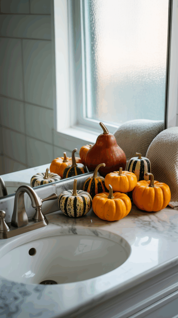 Gourds are a fun addition to any fall bathroom decor. Tiny pumpkins can brighten up your space and add a pop of color. Place them on the tub’s edge or near the sink for a cheerful touch.