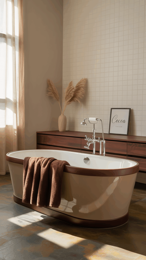 Cocoa brown accents bring warmth and a cozy feel to your bathroom. Think soft towels and earthy decorations that make the space feel inviting. These touches can easily transform your bathroom into a fall retreat.