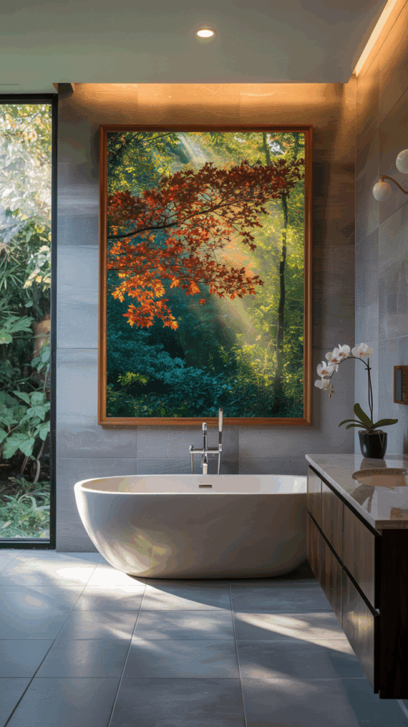 Nature-inspired wall art can truly bring the beauty of fall into your bathroom. Framed pictures of vibrant autumn trees create a cozy and inviting vibe. It’s a simple way to celebrate the season while adding a touch of warmth to your space.