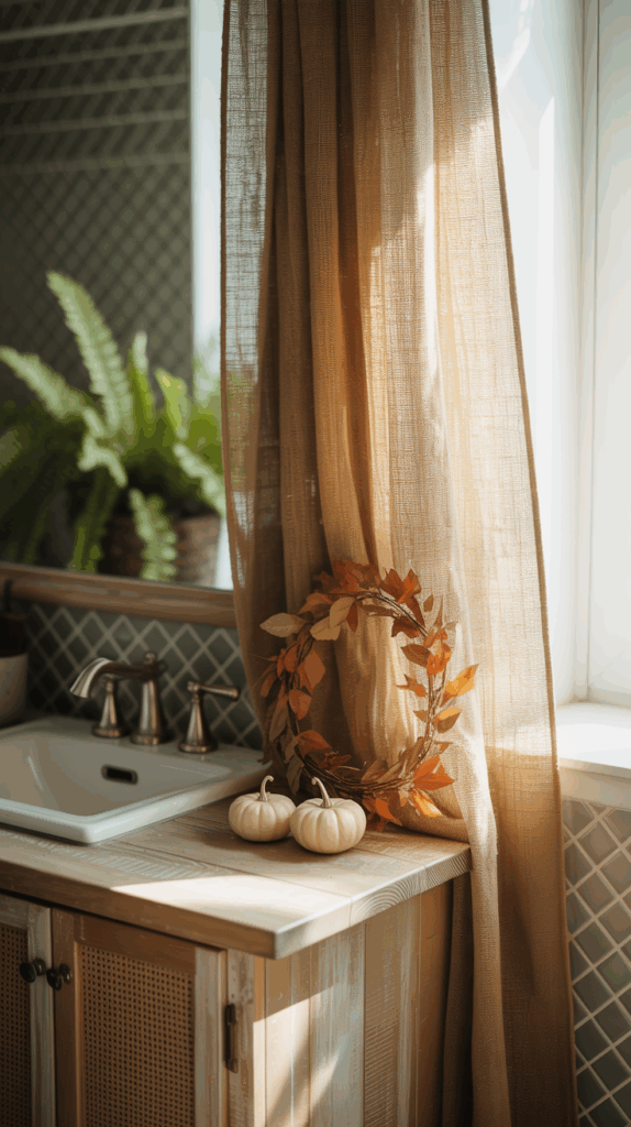 Burlap accents bring a cozy touch to your bathroom this fall. Consider using burlap curtains or a decorative wreath to add warmth and texture. Pair these with small pumpkins for a charming seasonal look.