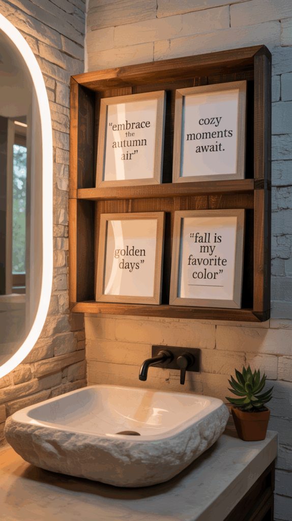 Framed quotes are a fun way to bring fall vibes into your bathroom. Choose quotes that celebrate the beauty of autumn and its cozy feel. These little reminders can lift your spirits each time you step in!