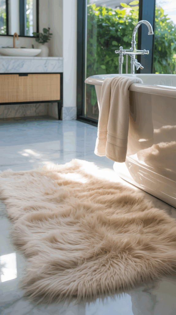 Faux fur rugs bring a cozy vibe to your bathroom, making it feel warm and inviting. They feel soft underfoot and add a touch of luxury, perfect for those chilly mornings. Plus, they’re easy to clean and maintain, which is a big win for any bathroom decor!