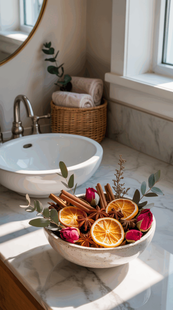 A bowl of colorful potpourri can instantly bring the essence of fall to your bathroom. Using dried flowers, leaves, and seasonal spices adds a warm touch to the space. Plus, it leaves a lovely, subtle scent that makes your bathroom feel cozy and inviting.