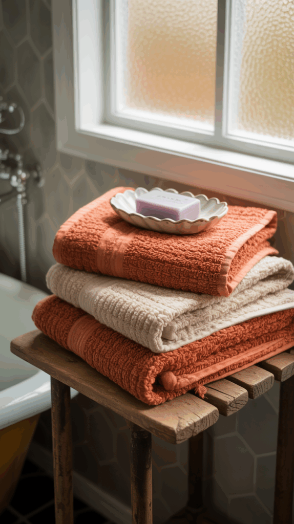 Flannel towels add a warm touch to your bathroom this fall. Their soft texture and rich colors bring comfort and style to your space. Hang a few in shades of orange and cream for a cozy vibe that embraces the season.