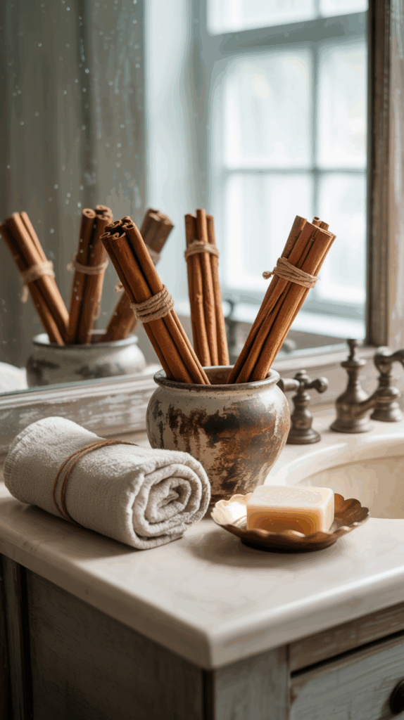 Cinnamon stick bundles are a charming touch for your fall bathroom decor. They add a warm, cozy vibe while bringing a delightful scent to the space. Simply place them in a cute vase or tie them with a bit of twine for an effortless, rustic look.