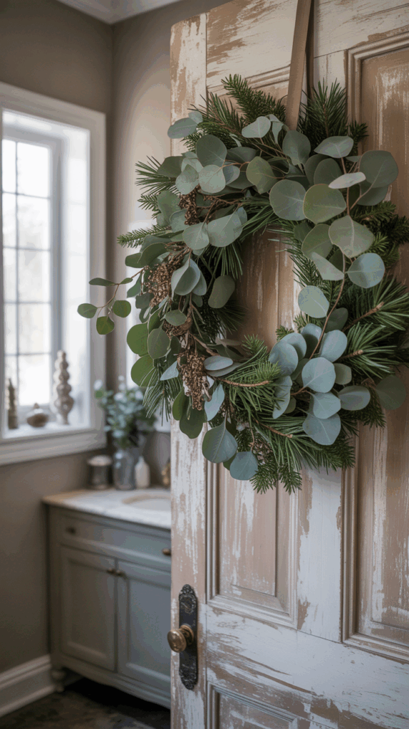 A eucalyptus and pine wreath is a lovely touch for your fall bathroom decor. Its natural greenery brings a fresh vibe that pairs well with seasonal accents. Hang it on your door or wall to warmly welcome guests into your space.