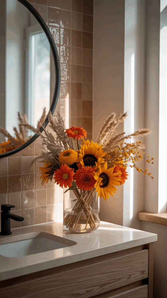 Brighten up your bathroom with a cheerful flower arrangement this fall. A mix of orange and yellow blooms brings the season’s colors indoors, creating a warm and inviting vibe. Place your favorite flowers in a simple vase for a lovely touch that can lift anyone’s spirits.