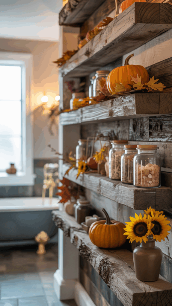 Rustic wooden shelves can bring a warm touch to your bathroom this fall. They are perfect for displaying seasonal decor like pumpkins and autumn leaves. Plus, they add a cozy vibe that makes your space feel inviting and stylish.
