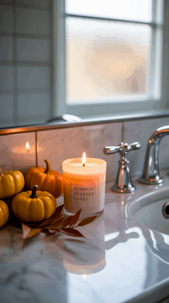 Pumpkin spice scented candles bring a cozy vibe to your bathroom this fall. The warm, inviting scent fills the space, making it perfect for relaxation. Pair them with cute pumpkins and autumn decor for a complete seasonal look!