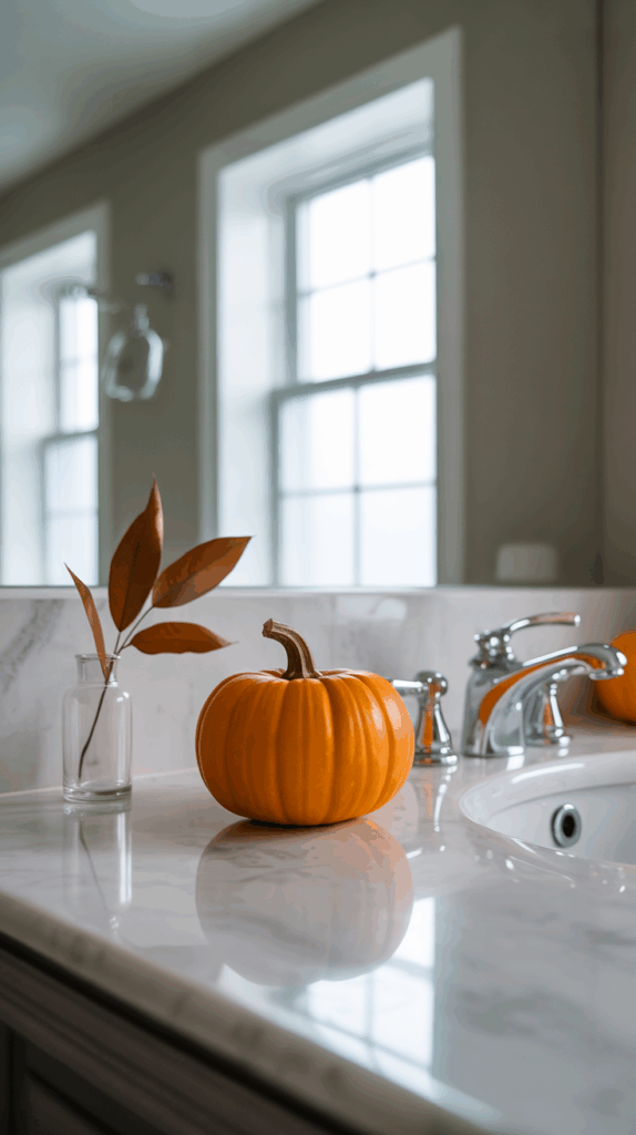 Adding a mini pumpkin to your bathroom decor is a fun way to celebrate fall. Place it on the countertop for a pop of color and a touch of seasonal charm. Pair it with some dried leaves or a small decorative piece for an easy yet stylish centerpiece.