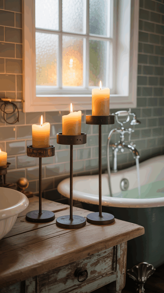 Rustic candle holders add a cozy touch to your fall bathroom decor. Opt for warm colors and natural materials to create a welcoming vibe. They not only provide soft lighting but also enhance the seasonal theme beautifully.