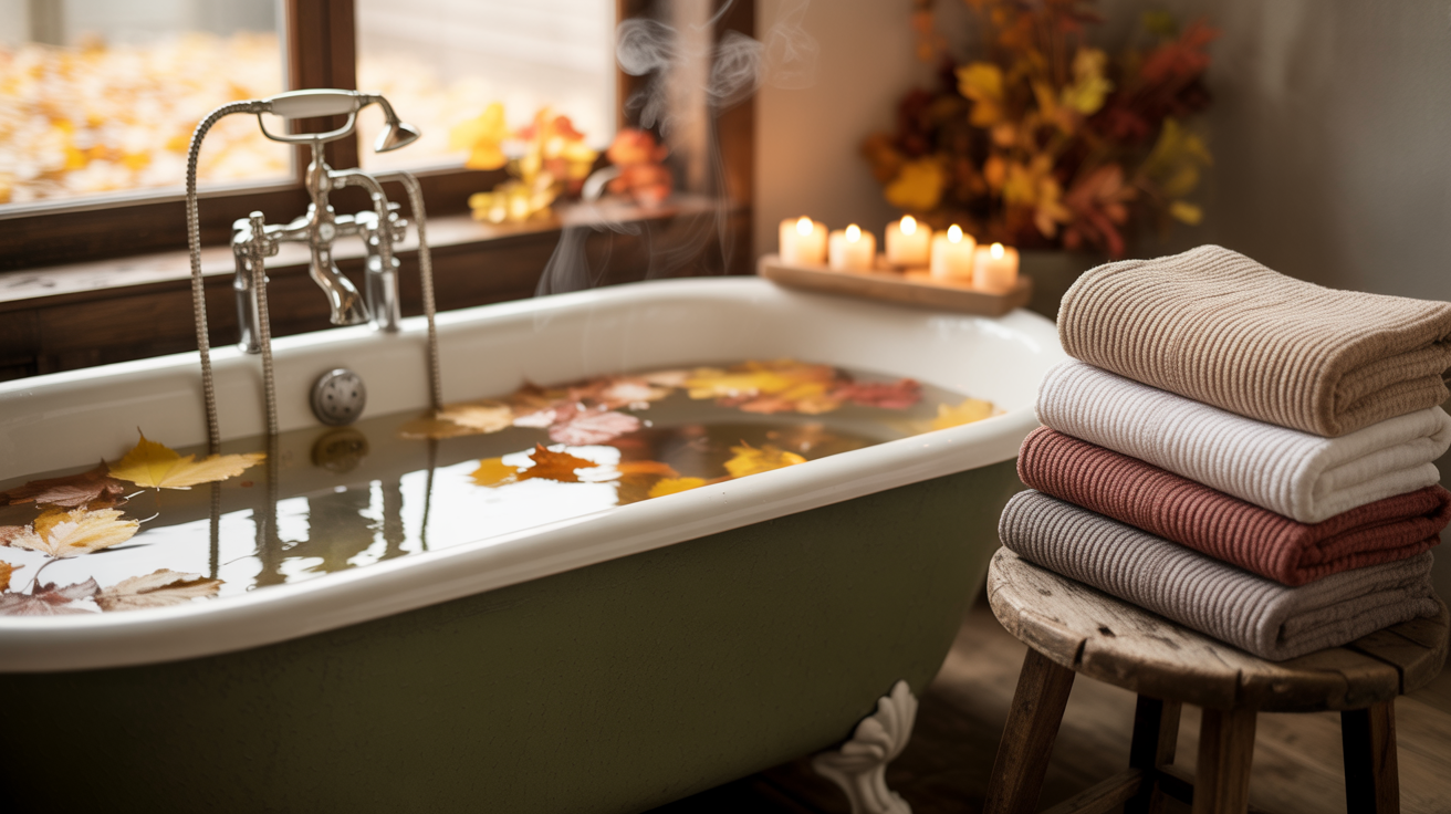Textured throw blankets are a great way to add warmth to your bathroom this fall. They not only look cozy draped over a chair but also invite you to snuggle up after a relaxing bath. Choose neutral colors to match your decor while adding a touch of seasonal comfort.