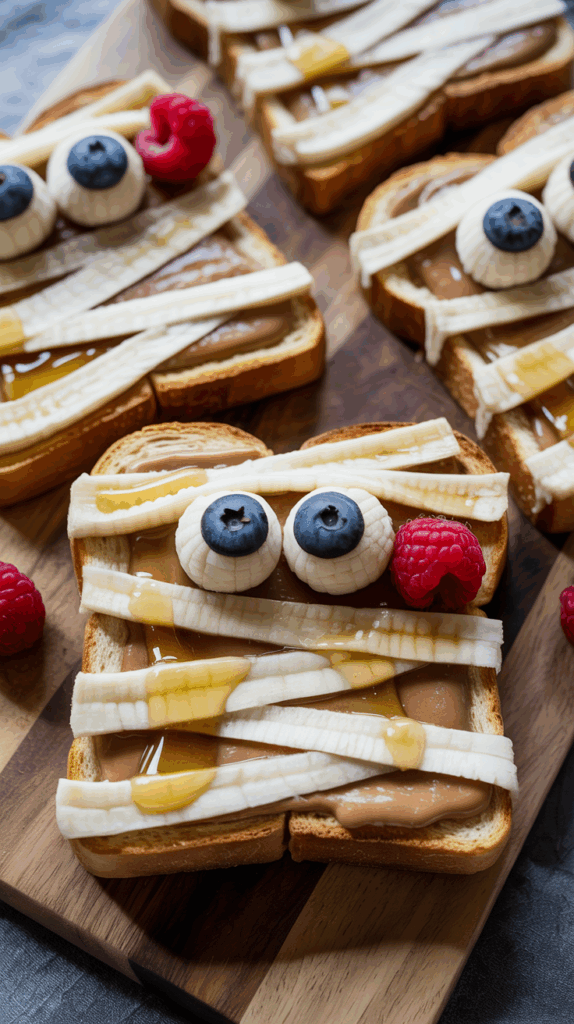 Toast slices of bread and spread with nut butter or chocolate spread. Layer thin banana strips or string cheese diagonally to mimic mummy bandages. Place two raisin or blueberry eyes peeking out from between the strips. For extra flair, add a raspberry “scar” or a drizzle of honey “cobwebs.” This quick breakfast gets bonus points for using simple ingredients and still looking like a Halloween masterpiece!