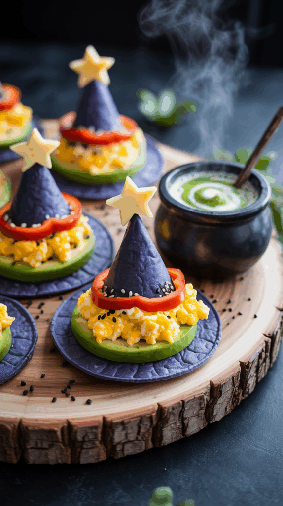 Turn mini breakfast tacos into adorable witch hats using blue corn tortillas! Fold them into cone shapes and fill with scrambled eggs, avocado, and a sprinkle of black sesame seeds. Place a bell pepper “hat brim” underneath and a tiny cheese star at the tip. Serve with a cauldron cup of hot cocoa or green smoothie “witch’s brew.” They’re spooky, savory, and bursting with flavor. The colors and shapes are straight from a fairytale. Great for imaginative play—watch kids wave their tacos like wands! It’s a Halloween breakfast you’ll want to repeat every year.