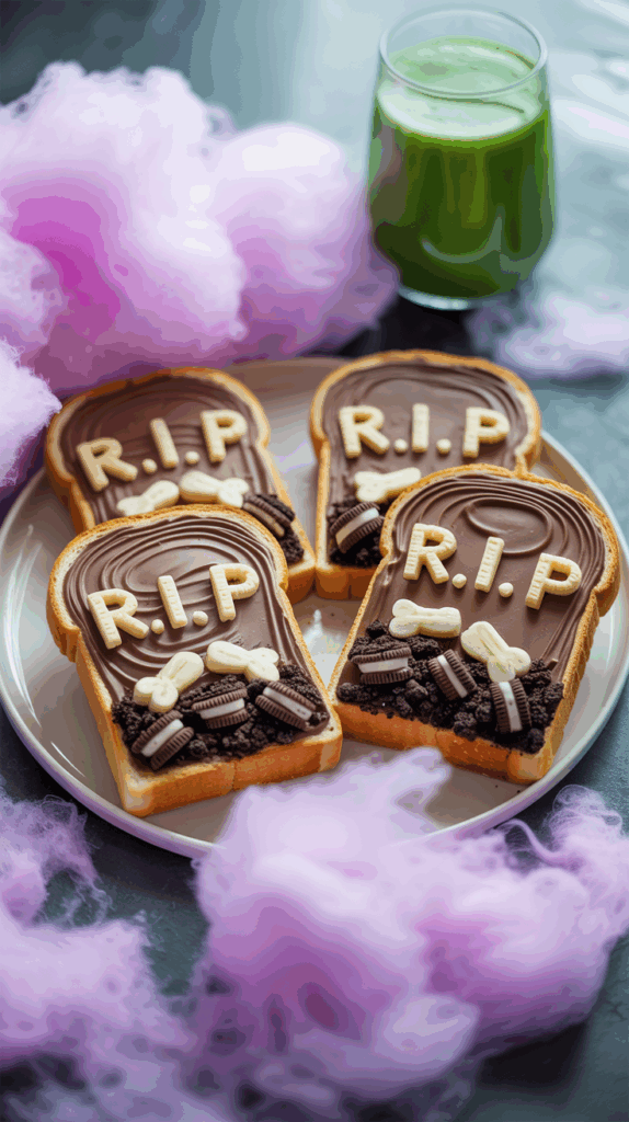Toast slices of bread and cut the tops into rounded gravestone shapes. Spread with black cocoa cream cheese or charcoal almond butter for a spooky base. Use alphabet cereal to “engrave” names like R.I.P. or silly ghost names. Add crushed Oreos at the bottom for soil and sliced banana “bones” sticking out. Serve each grave on a tray with a “fog” of cotton candy that vanishes when touched—pure magic! This one feels like a mini edible art project. Bonus points if you serve it with a green “zombie juice” smoothie. It’s eerie, creative, and super customizable. Perfect for little monsters with big imaginations.