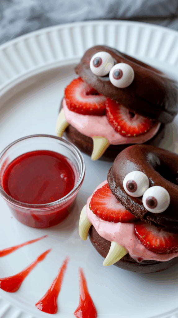 Take two mini chocolate-glazed donuts and sandwich strawberry cream cheese and sliced strawberries between them like “bloody fangs.” Stick plastic vampire teeth into one side to complete the look, with candy eyes peeking out from above. Serve with a side of “blood dip” (raspberry yogurt or puree) for extra drama. Use red food gel to draw bite marks on the plate or napkin. These are sugary, spooky, and laugh-out-loud funny. Kids will love taking a bite out of their own little vampires. They’re messy in the best way possible. And they look incredible in photos—just saying!