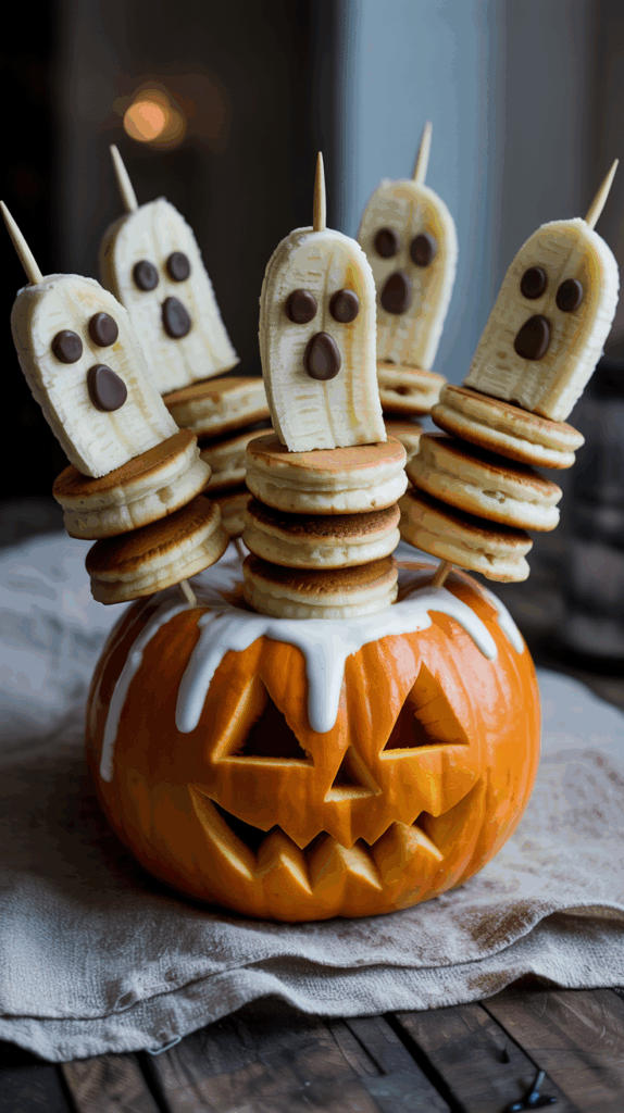 Slice bananas into thick coins, then skewer them alternately with mini pancakes or donut holes. Add mini chocolate chip faces on each banana coin to make a parade of tiny ghosts. Serve standing in a small carved-out pumpkin like a spooky display. Drizzle with yogurt or honey “ectoplasm” for extra giggles. Kids love pulling them off one by one like a ghosty kabob. No utensils needed—perfect for Halloween mornings on the move. Healthy-ish but totally themed. This breakfast is easy to prep and super fun to eat!