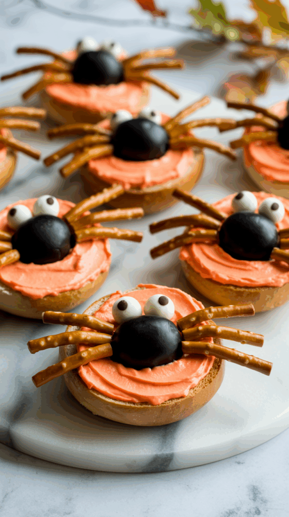 Spread purple or orange cream cheese on a toasted mini bagel. Add a large black olive or prune in the center for the spider’s body. Use thin pretzel sticks or apple slices for legs, four on each side, sticking out from the bagel. Finish with tiny candy eyes or mini chocolate chips for a face. This creepy crawler breakfast is a perfect balance of savory and silly. Kids love building their spider before they gobble it up. You can even use raisin bread for an extra Halloween twist. They’re portable and great for lunchboxes too. Who knew bagels could crawl?