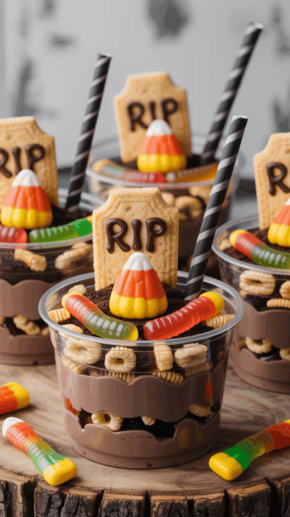 Use clear plastic cups layered with chocolate yogurt “dirt” and crushed cereal “bones.” Add a gummy worm or two and a small cookie gravestone with “RIP” written in icing. Top with candy corn pumpkins for a pop of color. Stick in a spooky paper straw or plastic skeleton spoon. This is the ultimate grab-and-go Halloween breakfast treat. It’s fun for classroom mornings or themed brunches. Parents can prep them the night before for a no-stress morning. The layers are oddly satisfying to spoon through. Each bite is a creepy surprise!
