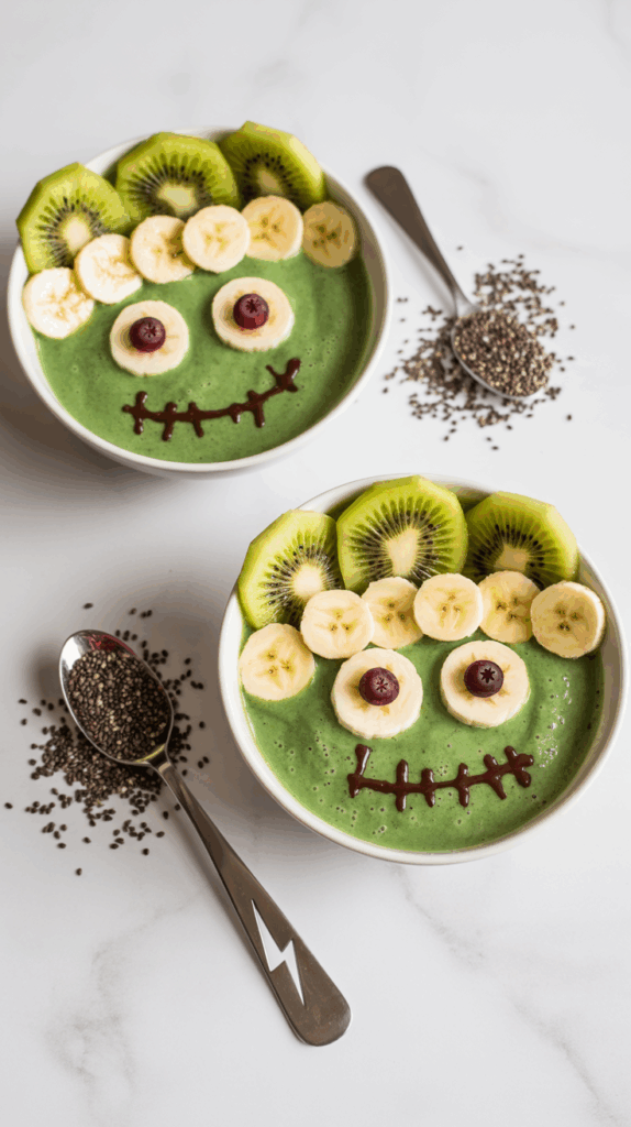 Blend a green smoothie base using spinach, banana, and mango. Pour into a bowl and use fruit slices to make a Frankenstein face—kiwi hair, banana bolts, and berry eyes. Use a black food marker or chocolate syrup to add stitched eyebrows and a toothy grin. Sprinkle chia seeds or granola bolts on the sides like his “screws.” Serve with a spoon that has a lightning bolt cutout on it for fun flair. Kids will get a kick out of “eating Frankenstein’s face.” It’s monstrously healthy and scary-cute at the same time. A brilliant balance of fun and fuel!