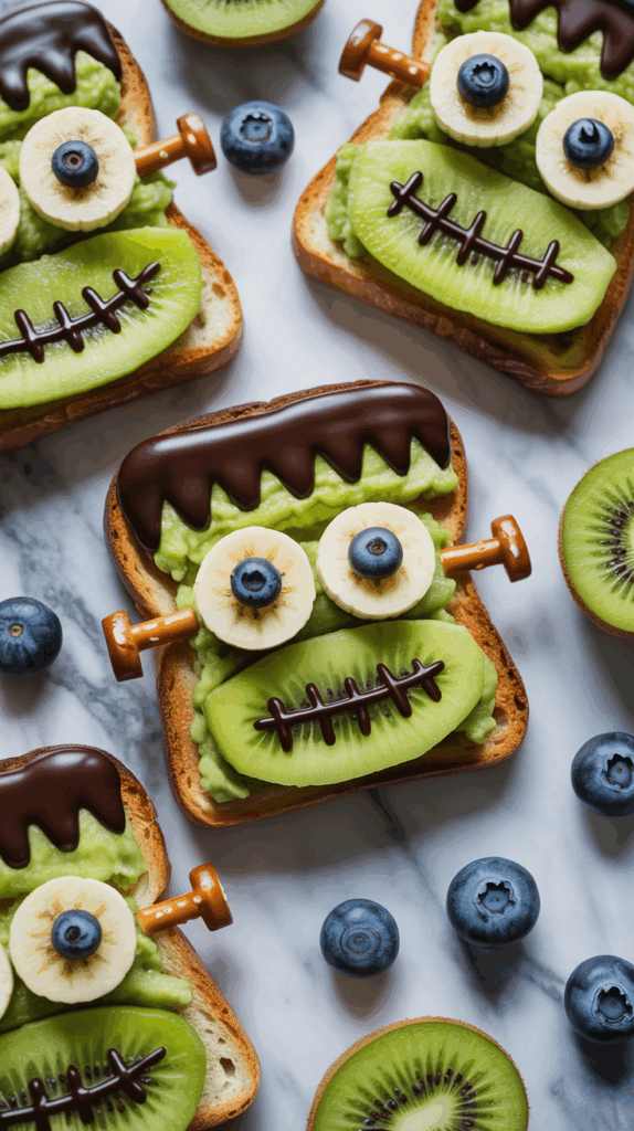 Frankenstein Toasts with Kiwi Skin & Blueberry Bolts