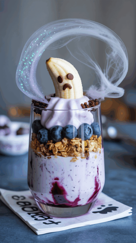 Layer vanilla yogurt, granola, and blueberries in a glass, but give it a ghostly makeover by topping it with a banana half shaped into a ghost—mini chocolate chips for eyes, of course! Use a piping bag to swirl extra yogurt around the ghost like a mist. Add edible glitter or silver sprinkles for a magical touch. Kids get to “rescue” the ghost with each spoonful. It’s hauntingly healthy and magically fun. Serve with ghost napkins or Halloween cups for the full effect. These parfaits are easy to prep and great for little helping hands. They’re spooky without being sugary overload.