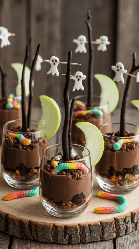 Layer chocolate yogurt, crushed chocolate granola, and gummy worms in clear cups to mimic a spooky forest floor. Stick in black licorice “tree trunks” and candy ghosts flying above using toothpicks. Add a green apple slice cut like a crescent moon on the rim. The whole thing becomes a mini edible Halloween diorama. Kids will have fun exploring it layer by layer—and it’s surprisingly healthy with all the yogurt and fruit!