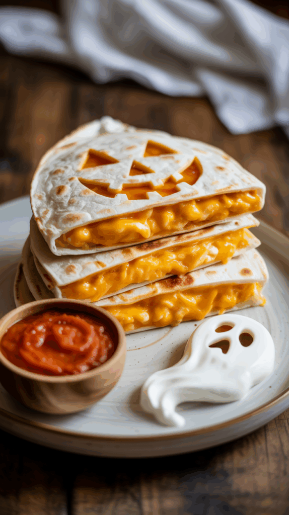 Start with two whole wheat tortillas and fill them with scrambled eggs and cheddar cheese. Carefully carve out jack-o’-lantern faces from the top tortilla just like you would a real pumpkin! Grill the quesadilla face-down so the cheesy filling glows through the cutouts. Serve with a side of salsa “lava” for dipping and a dollop of sour cream shaped like a ghost. The combo of warm, melty cheese and fun cutouts makes this a showstopper. Kids will adore seeing their breakfast grinning back at them. It’s a great savory break from all the sweets. And it’s quick enough to whip up on a school morning with a Halloween twist!
