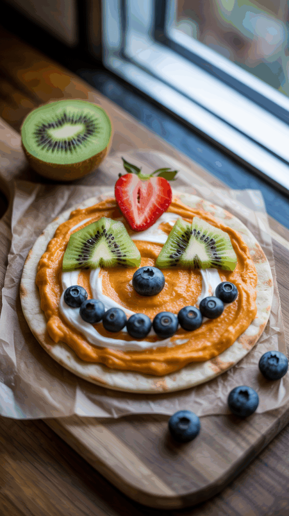 Make a mini breakfast pizza using a tortilla or flatbread as the base. Spread with pumpkin cream cheese or sweetened mashed sweet potato. Create jack-o’-lantern faces using cut-out fruit like kiwi triangles for eyes, blueberries for the mouth, and a strawberry “stem” at the top. Toast until warm and slightly crisp for a handheld breakfast that looks just like a smiling pumpkin! It’s an adorable combo of sweet, savory, and spooky—and totally photogenic for your Halloween morning table.