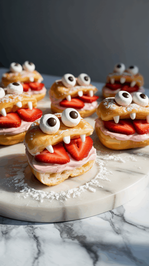 Slice plain mini donuts in half and fill with strawberry cream cheese and sliced strawberries. Add candy eyes on top and use mini marshmallows or banana slices as fangs poking out of the filling. Use a toothpick or pretzel stick to anchor them if needed. Each donut becomes a tiny monster mouth bursting with sweet “gore.” It’s a silly-scary twist on a breakfast sandwich that kids won’t stop giggling over.