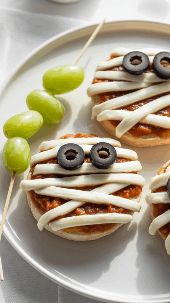 Toast an English muffin, spread it with pizza sauce, and add thin mozzarella strips to create “mummy wrappings.” Use sliced olives or pepperoni pieces for eyes peeking through the cheese. Bake until melted and just golden. Plate with green grapes on skewers labeled “monster toes.” This spooky spin on breakfast pizza is both familiar and fun. You can sneak in veggies like bell pepper under the cheese. It’s a perfect savory option for kids who love the idea of food dressed in costume. Plus, it doubles as a party brunch idea!